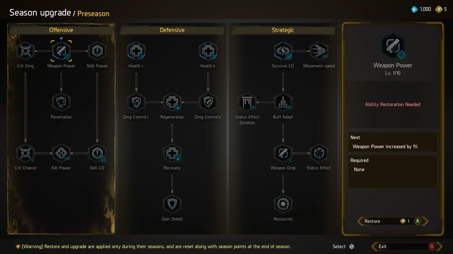 Like other roguelike/rogue-lite games, permadeath is part of the game cycle. If you die, you start from the beginning. However, this is a roguelite game, and there is some progression carried over. This includes replicated Relics, which your character can store up to 4. You can use Crons (blue) and Season Points (yellow) that allow permanent upgrades to stats for the duration of the season. These points can be obtained through the season pass (XP to progress).